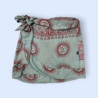 Falda pareo turquesa con dibujo estampado en rojo.