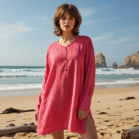 Kurta de rayón en color chicle y con detalles en rojo.