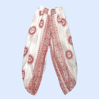 Pantalón de color blanco y detalles en rojo con diferentes estampados. Incluye una goma a la altura de la cintura tipo nido de abeja, con la que podrás ajustarla perfectamente. Apertura lateral como en la segunda foto.