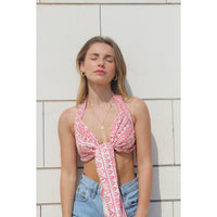 El diseño de este top permite atarlo de distintas maneras. (Lo entregamos con un aro para uno de los atados)