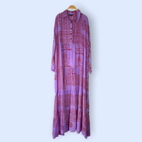 Vestido de color Lila y detalles en rojo ,con un cuello de Camisa. Incluye un cinturón con el que podrás ajustarte a la perfección tu prenda.