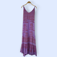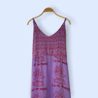 Vestido de tirantes ajustables, color lila y detalles en rojo.