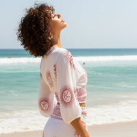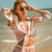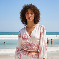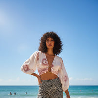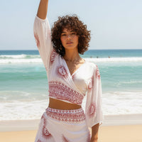 Bolero o Top de color blanco y detalles en rojo con diferentes estampados disponibles. Esta prenda viene pisando fuerte, y será una de las esenciales este verano.