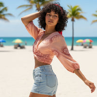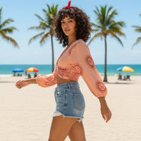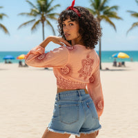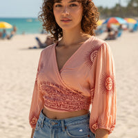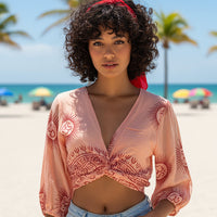 Bolero o Top de color salmón y detalles en burdeos con diferentes estampados disponibles. Esta prenda viene pisando fuerte, y será una de las esenciales este verano.