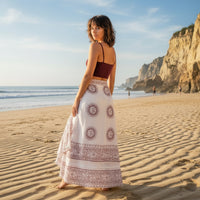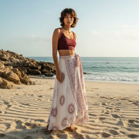 Una de las prendas indispensables este verano es la falda pareo. La nuestra, en versión larga, resulta muy cómoda para ir a la playa, pero en general nos sirve para cualquier plan.