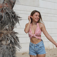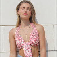 El diseño de este top permite atarlo de distintas maneras. (Lo entregamos con un aro para uno de los atados)