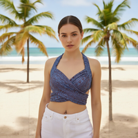 El diseño de este top permite atarlo de distintas maneras. (Lo entregamos con un aro para uno de los atados)