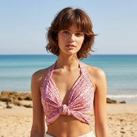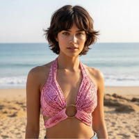 El diseño de este top permite atarlo de distintas maneras. (Lo entregamos con un aro para uno de los atados)