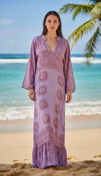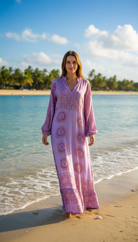 Vestido de color lila y detalles en rojo y con cuello estilo Mao. Incluye un cinturón con el que podrás ajustarte a la perfección tu prenda.